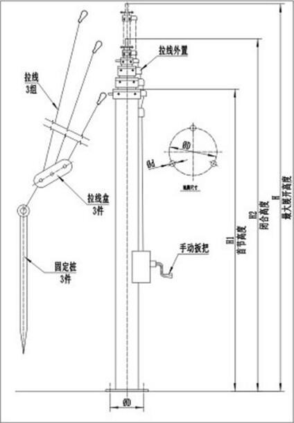 9。车载升降桅杆是通过在车顶固定,或者安装在车周边,并通过拖盘及支撑架联合固定。客户设备在选择时,应根据不同型的安装面到顶的高度而确定车载升降桅杆的原始高度。致使产品装于顶时,其原始高度为最矮,确保车体有最大的高度通过性及尽量地减少设备的风阻